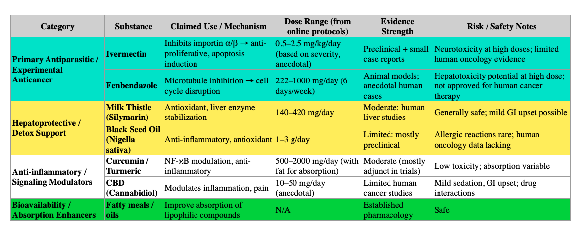 - Ivermectin & Fenbendazole carry higher systemic risk at experimental doses.
